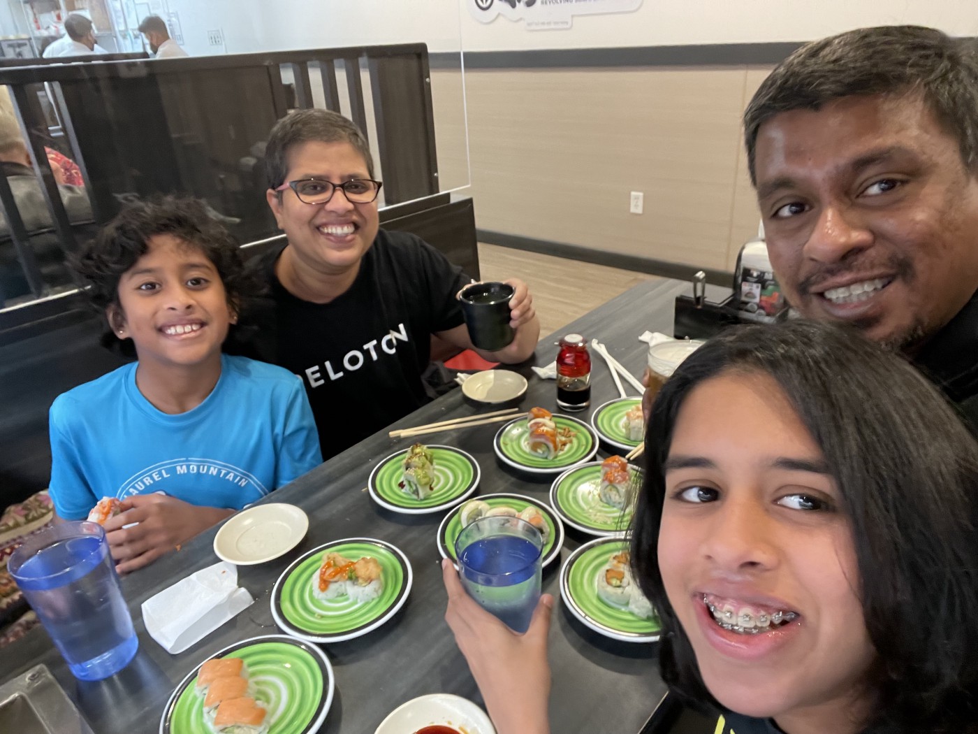 On the day of my last treatment, Robin was with me at the doctor’s office, and I just cried knowing I didn’t have to come for the infusions — I felt on top of the world with the new life and looked forward to continuing making some fantastic memories. With the COVID cases still on high earlier in the year, Robin was not allowed in the infusion area, so I read the proclamation on the wall and rang the bell to celebrate the end of treatment. Kids also joined us and were waiting in the parking lot for me. We went for Sushi — one of our family’s favorite food and friends stopped by in the evening for a small celebration.