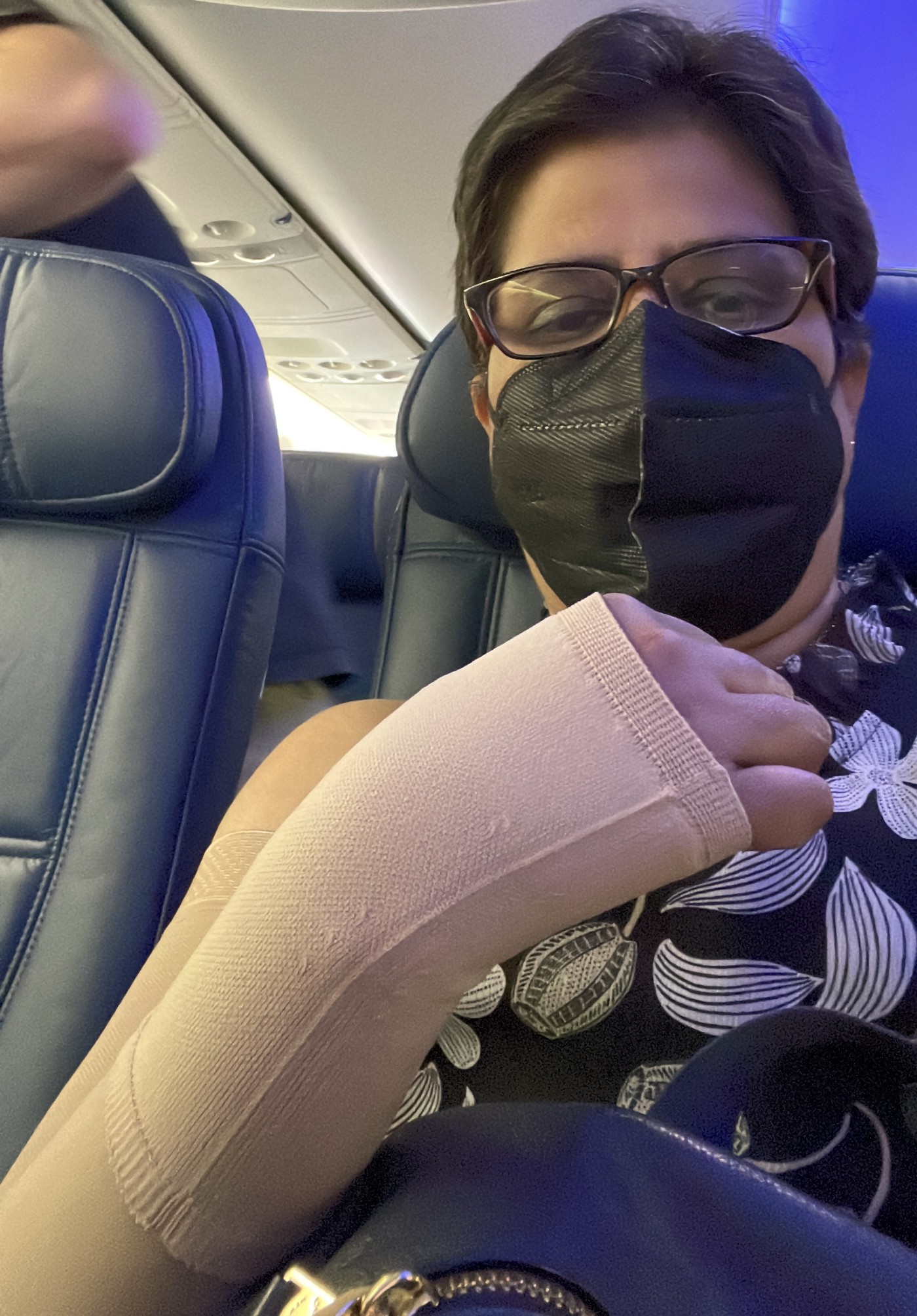 What is Lymphedema? It is a build-up of lymph fluid under your skin, causing swelling and discomfort, and in the absence of lymph nodes, the fluid cannot drain on its own. So during the physical therapy sessions, my therapist would drain the fluids manually and teach me exercises to use my back and shoulder muscles effectively to avoid any ergo pain. She taught me to recognize fluid accumulation, swelling, stiffness, etc., managing the self-drainage of the fluid to feel comfortable.